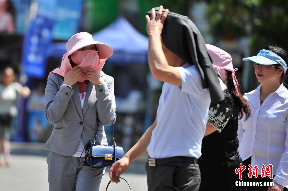 5月7日,炙热的阳光让昆明进入“烧烤模式”,街头的市民使出多种方法遮阳。中新社发 刘冉阳 摄