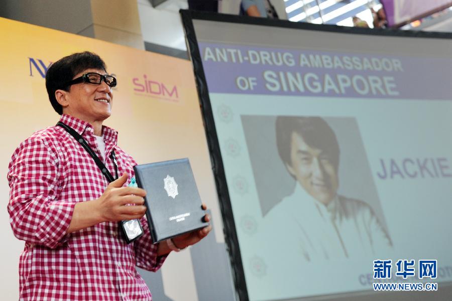 5月7日,演员成龙出席在新加坡南洋理工学院举行的委任仪式。当日,新加坡中央肃毒局在南洋理工学院举行禁毒展并委任成龙为首个“新加坡禁毒形象大使”。 新华社发 邓智炜 摄 图片来源:新华网
