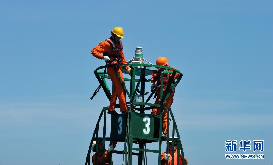 5月9日,“海巡171”船上的工作人员在西沙永兴岛对灯浮进行油漆保养。 5月7日,交通运输部南海航海保障中心启动2015西沙水域航标巡检工作,该中心所属大型航标船“海巡171”船满载巡检设备及专业技术人员,从广州仑头航测基地起航,开赴三沙永兴岛,开展为期15天的西沙水域例行航标维护巡检工作。本次巡检还将组织技术骨干对西沙水域七连屿等岛礁等进行勘察,调研了解船舶航行水域导助航设施建设需求,同时对西沙水域海上安全通航信号进行测试,进一步完善该水域导助航设施建设配布方案,保障船舶通航安全,服务该水域居民安全便捷出行。新华社记者 赵颖全 摄