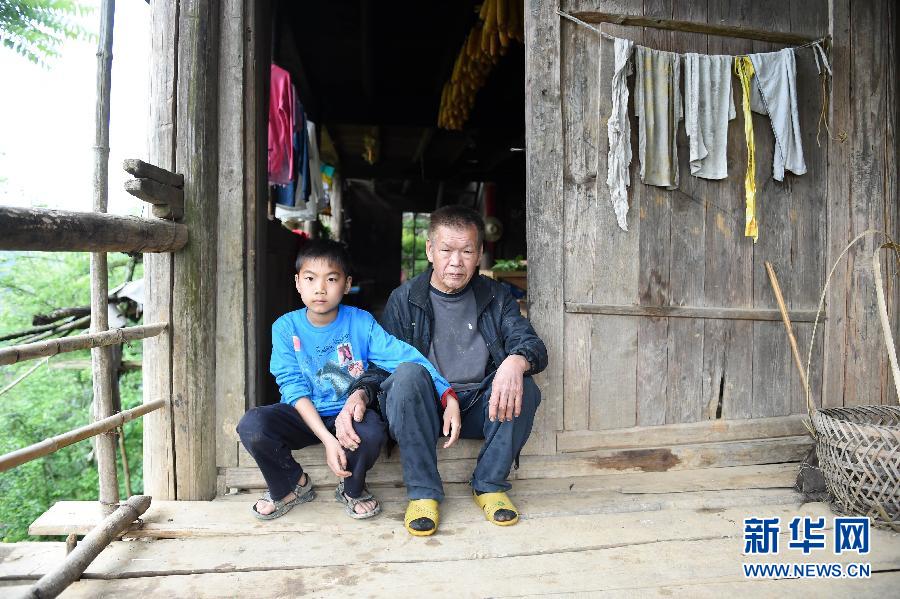 阳董超和爷爷坐在家门口(5月5日摄)。阳董超家住东升村秧地村民小组,今年10岁,是东升小学四年级学生。在他3个月的时候,妈妈就离开了他。爸爸外出务工,已经5年没有回来了。现在,他和爷爷一起生活。在广西龙胜各族自治县马堤乡东升村,有一群特殊的留守儿童——他们出生后不久,由于生活条件艰苦等原因,他们母亲离开了家庭,而父亲常年外出务工,他们只能和祖父母生活在一起。据东升村委会主任阳章生介绍,东升村地处偏远,人多地少,经济条件相对较差,很多孩子的母亲都是他们父亲外出打工后认识的外地女青年,她们来到这里结婚生子后,感到这里条件艰苦生活困难,生完孩子不久便离家出走,不再回来,“有些是孩子出生才3个月妈妈就出走了,孩子10多岁了妈妈长什么样子都不知道”。东升小学校长杨光友说,当地大多数青壮年在农忙之余都要外出务工补贴家用,把一大批未成年的孩子留在家里成为留守儿童。目前,东升小学148个学生中就有留守儿童63人,其中单亲留守儿童14人。东升小学做过的一次调查数据显示,全校留守儿童中学习成绩优秀的不到20%。“由于正常家庭教育的缺失,留守儿童身心发展尤其是品德、心理健康成长方面存在的问题日益凸显。” 新华社记者 陆波岸 摄