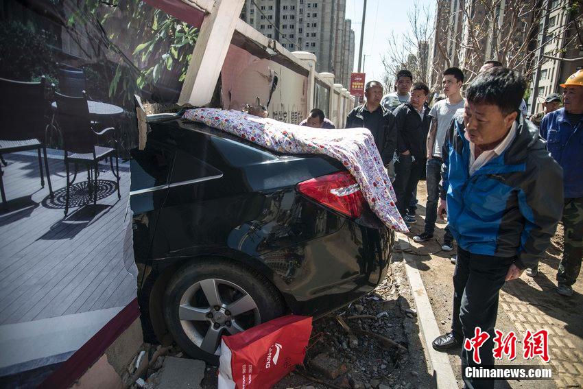 2015年5月5日消息,沈阳一名女司机在驾车时连撞两车,车辆失控,冲向路边工地围墙,将墙撞开后卡在墙中。救援人员找来很多棉被蒙在车身上,把轿车包裹严密之后,先用吊车把架在车顶的大墙横梁调离,再用钢索将车固定稳固后吊起。
