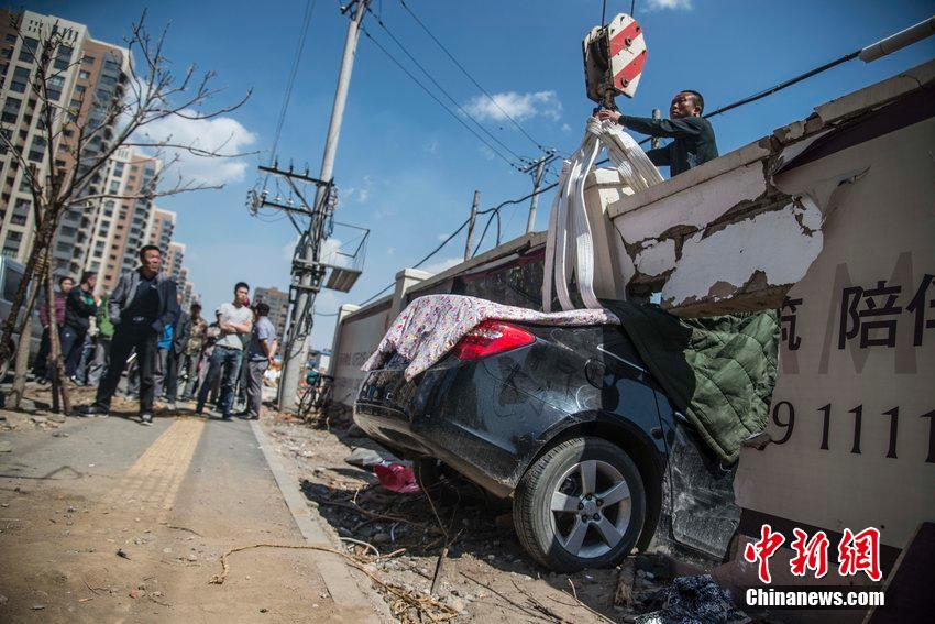 2015年5月5日消息,沈阳一名女司机在驾车时连撞两车,车辆失控,冲向路边工地围墙,将墙撞开后卡在墙中。救援人员找来很多棉被蒙在车身上,把轿车包裹严密之后,先用吊车把架在车顶的大墙横梁调离,再用钢索将车固定稳固后吊起。