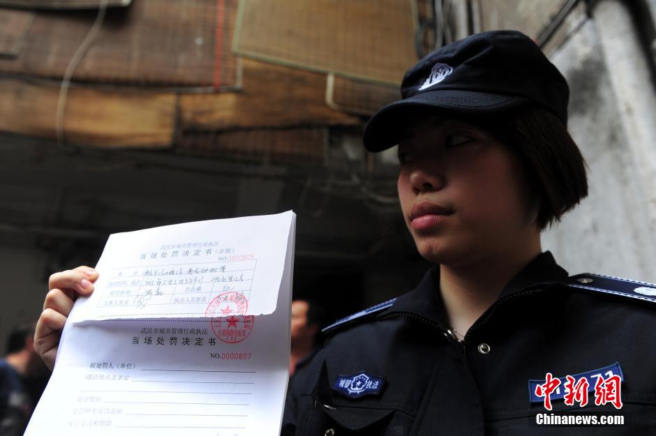 5月5日,武汉市硚口区汉正街城管执法队员针对一起高空抛物行为开出人民币50元的罚单。这也是该市自5月1日起正式实施高空抛物有奖举报实施细则以来的首例经认证属实并锁定当事人的高空抛物行为,此举在中国内地城市中尚属首创。高空抛物行为往往发生突然,全过程也就是一瞬间,取证难度较大。武汉市硚口区汉正街城管部门在辖区内率先设置20多个高清摄影头,以自下而上的角度,对准常出现高空抛物的高层建筑。图为武汉城管开出的第一张高空抛物的罚单。中新社发 张畅 摄