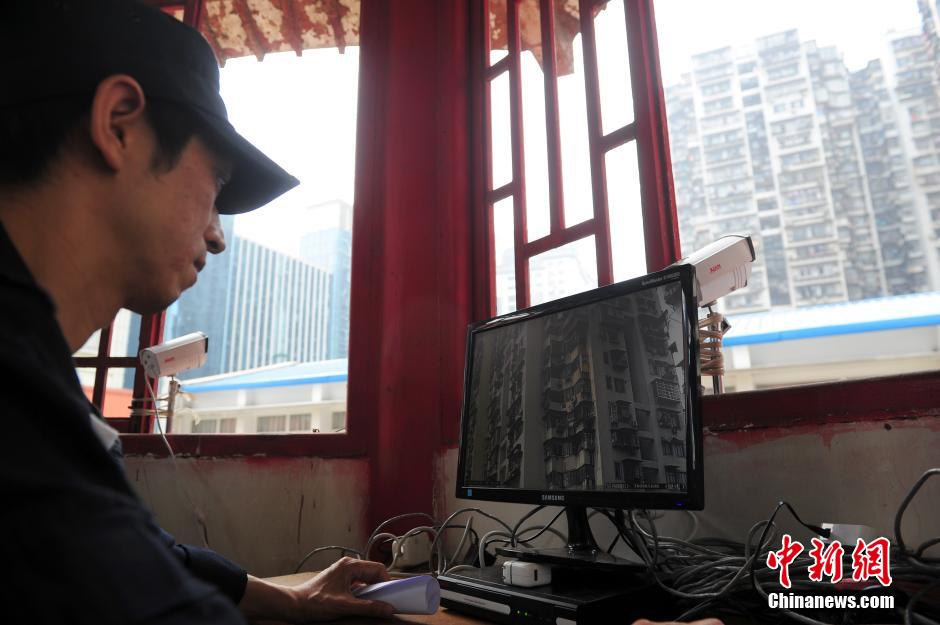 5月5日,武汉市硚口区汉正街城管执法队员针对一起高空抛物行为开出人民币50元的罚单。这也是该市自5月1日起正式实施高空抛物有奖举报实施细则以来的首例经认证属实并锁定当事人的高空抛物行为,此举在中国内地城市中尚属首创。图为武汉市硚口区城管委汉正中队用高清摄影头监控高空抛物。中新社发 张畅 摄