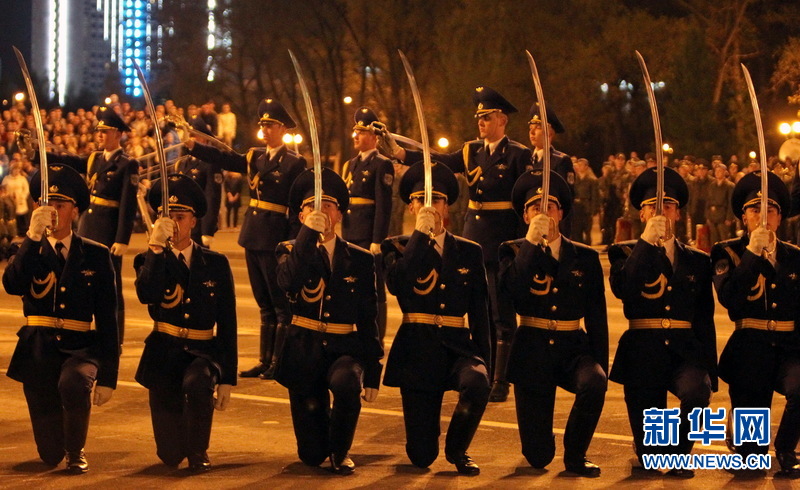 5月4日夜,白俄罗斯举行纪念伟大卫国战争胜利70周年阅兵彩排。中国红旗牌检阅车行驶在白俄罗斯首都明斯克市胜利者大街和马舍洛娃大街的交汇口。据悉,这是红旗检阅车,首次走出国门亮相主权国家重大庆典活动。图为白俄罗斯参加检阅的官兵正在彩排。陈俊锋摄 图片来源:新华网