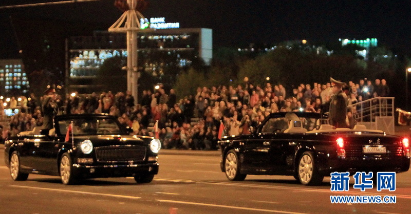 5月4日夜,白俄罗斯举行纪念伟大卫国战争胜利70周年阅兵彩排。中国红旗牌检阅车行驶在白俄罗斯首都明斯克市胜利者大街和马舍洛娃大街的交汇口。据悉,这是红旗检阅车,首次走出国门亮相主权国家重大庆典活动。图为白国防部长安德烈 拉夫科夫站在前一辆红旗检阅车上。陈俊锋摄 图片来源:新华网
