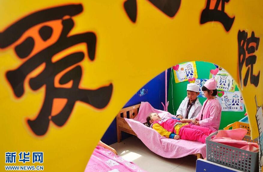 5月6日,在浙江省宁波市镇海区宝山幼儿园的模拟“爱心医院”,小朋友分别扮演医生护士和患者,体验就医的场景。为提升幼儿的素质教育水平,宁波市镇海区宝山幼儿园模拟医院的工作流程,将模拟“爱心医院”搬进幼儿园,让孩子们在校园内体验就医流程中,医生、护士与患者的不同位置和处事情景,从小培养孩子养成爱护个人卫生,关心体谅他人的好习惯。新华社发 胡学军 摄