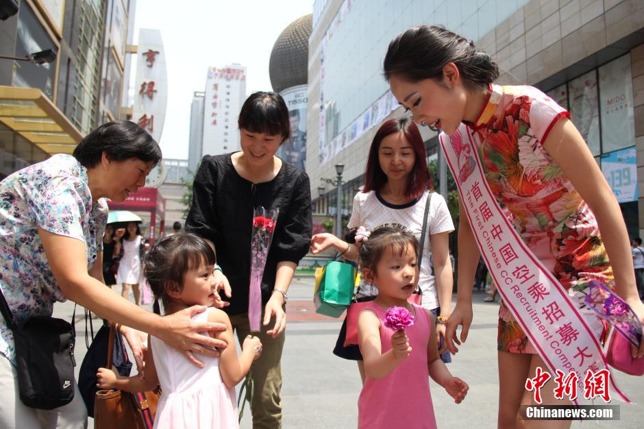 5月10日是母亲节,在中国首届空乘招募大赛上获得前十强的佳丽来到成都IFS广场、远洋太古里,向过往的民众发送康乃馨,祝福全天下的母亲,母亲节快乐!祝天下母亲节日快乐!钟欣 摄