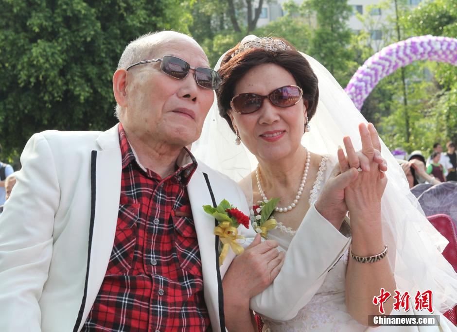 5月10日,“甜蜜蜜,你笑的甜蜜蜜,好像花儿开在春风里……”伴着邓丽君经典歌曲《甜蜜蜜》,在台湾著名词人庄奴和台湾著名作曲家古月的见证下,29对银发伉俪在重庆青杠老年护养中心举行了集体金婚庆典。周毅 摄