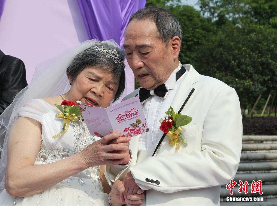 5月10日,“甜蜜蜜,你笑的甜蜜蜜,好像花儿开在春风里……”伴着邓丽君经典歌曲《甜蜜蜜》,在台湾著名词人庄奴和台湾著名作曲家古月的见证下,29对银发伉俪在重庆青杠老年护养中心举行了集体金婚庆典。周毅 摄