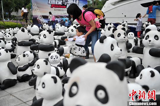 5月10日,上百只形态各异,模样呆萌的陶制“熊猫”亮相福州街头,吸引了许多小朋友拍照留念。中新社发 吕明 摄