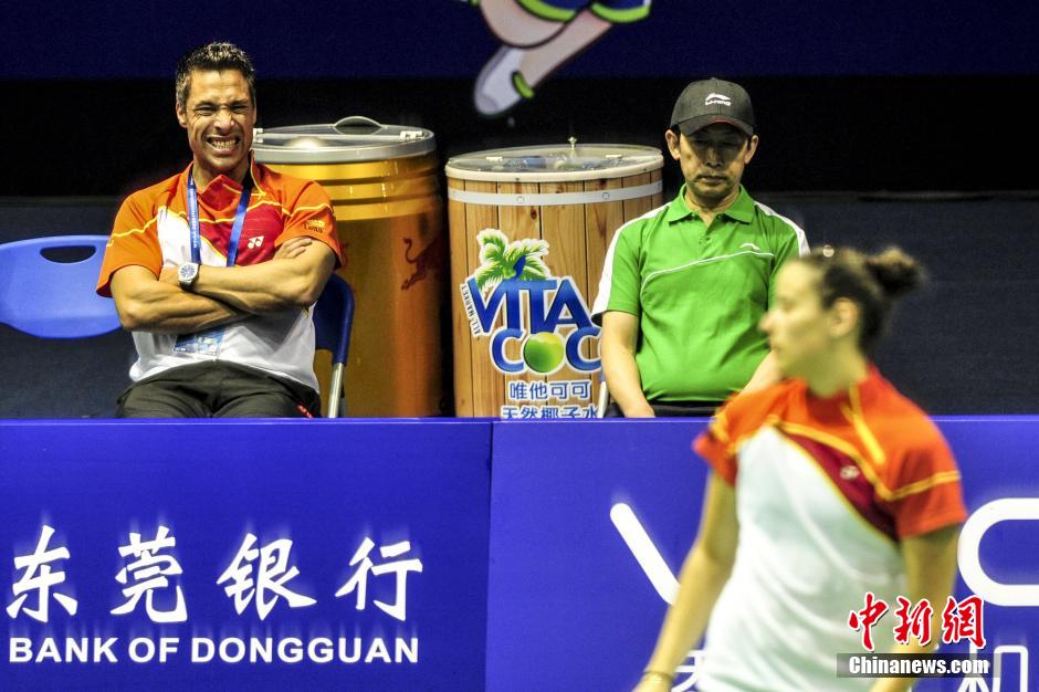 5月10日,荷兰队小组赛首场与加拿大队展开较量,在混双比赛中,荷兰队选手出现失误,教练满脸可惜之情。当日,2015年苏迪曼杯世界羽毛球混合团体赛在东莞举行,来自35个国家和地区的羽毛球代表队、400多名羽毛球运动员在东莞市篮球中心一决高下。陈骥旻 摄