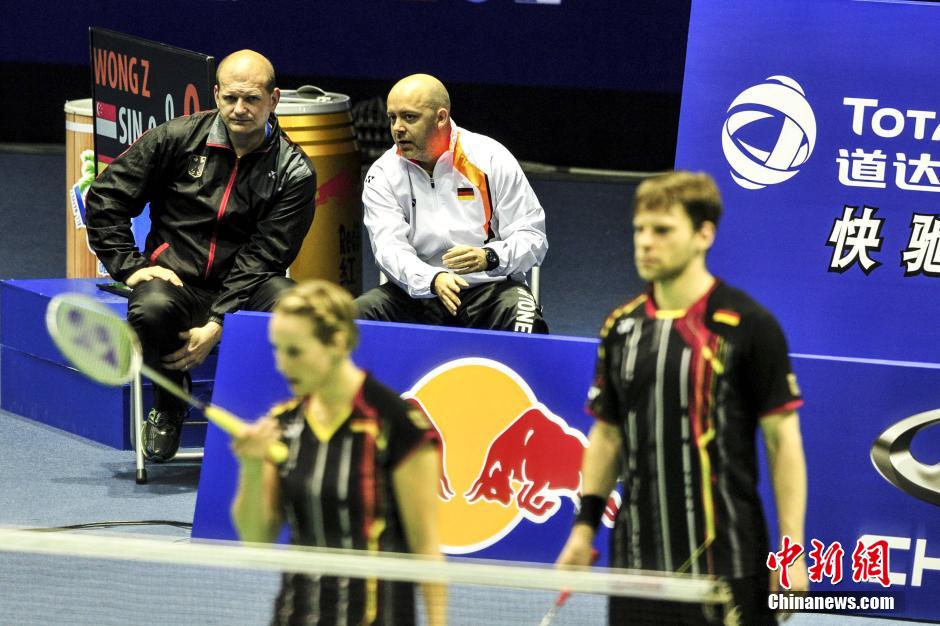 5月10日,德国队小组赛首场便挑战实力强劲的中国队,在混双比赛中,德国队教练现场讨论战术。当日,2015年苏迪曼杯世界羽毛球混合团体赛在东莞举行,来自35个国家和地区的羽毛球代表队、400多名羽毛球运动员在东莞市篮球中心一决高下。陈骥旻 摄