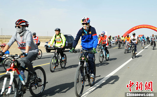 5月9日,甘肃肃北县“第二届梦柯冰川杯自行车挑战赛”鸣枪开赛,来自肃北、敦煌、瓜州的180名自行车运动爱好者在肃阿公路展开40公里的角逐。李彬 摄