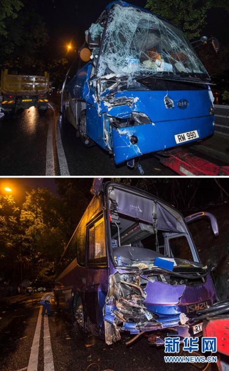 图为交通事故涉及的两辆旅游巴士(拼版照片,5月11日摄)。 5月11日,港岛南区香岛道发生交通意外,涉及两辆分别载有韩国及内地游客的旅游巴士及一辆卡车,事故造成53人受伤,其中17人较严重。新华社记者 何靖嘉 摄 图片来源:新华网