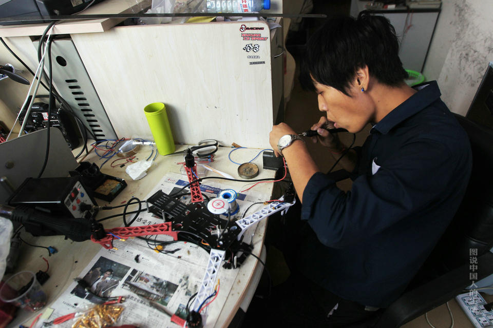 无人机所有的机械零件,都是由团队独立焊接,做到真正的自主研发。图为工作人员正在焊接多旋翼无人机的飞机叶片零件。