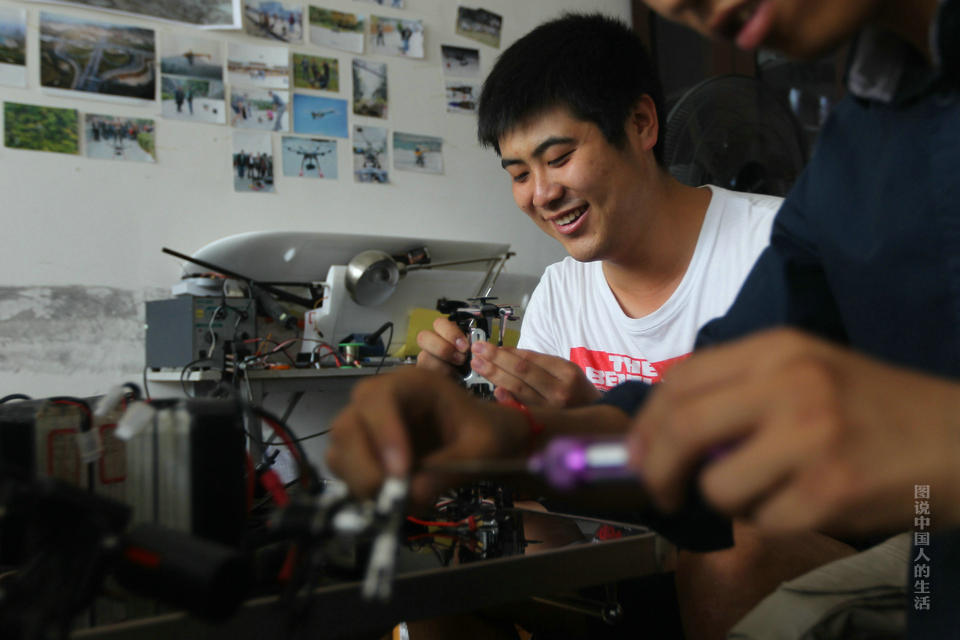 “斯凯威”的办公地,位于贵阳市国家高新区大学生创业园内。走进工作室,看到十几架小型多旋翼摆放整齐,北京高校毕业的郝醇正拿着螺丝刀蹲在地上,将机架、电机、电池等零件装上一台8旋翼无人机。
