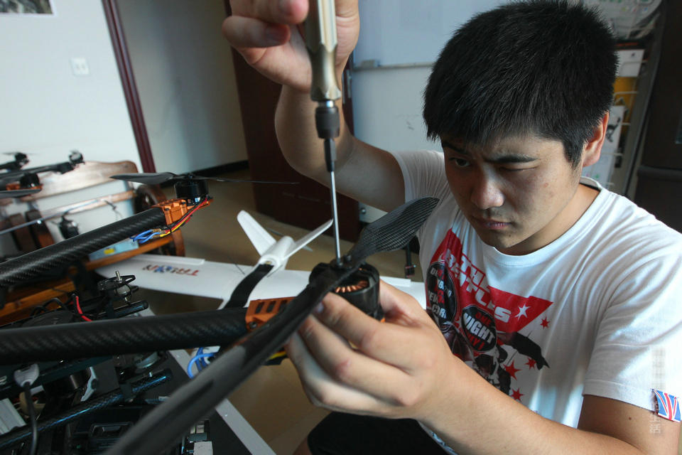 郝醇正在安装无人机上的动力机械部分。“我关了门面,开始学习无人机的技术,在国外网站找资料,摸索着自主研发无人机。”张睿昕说,“通过图纸,再从网上买来零件,我们造出了第一架飞机。”2011年,一个高尔夫球场的航拍项目让他们赚到了第一桶金。“慢慢地,我们的市场也由省内发展到全国。”