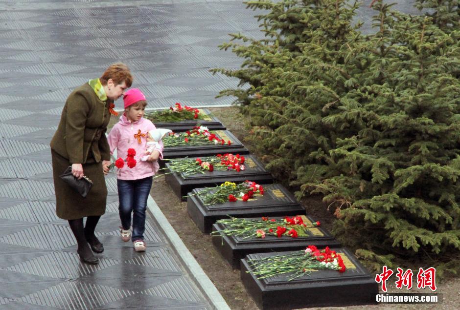 5月7日,俄罗斯圣彼得堡二战胜利广场。一位俄罗斯母亲带着孩子向二战“英雄城市”纪念物献花。5月9日,俄罗斯将举行盛大阅兵式等庆典活动,纪念卫国战争胜利70周年。 中新社发 田冰 摄