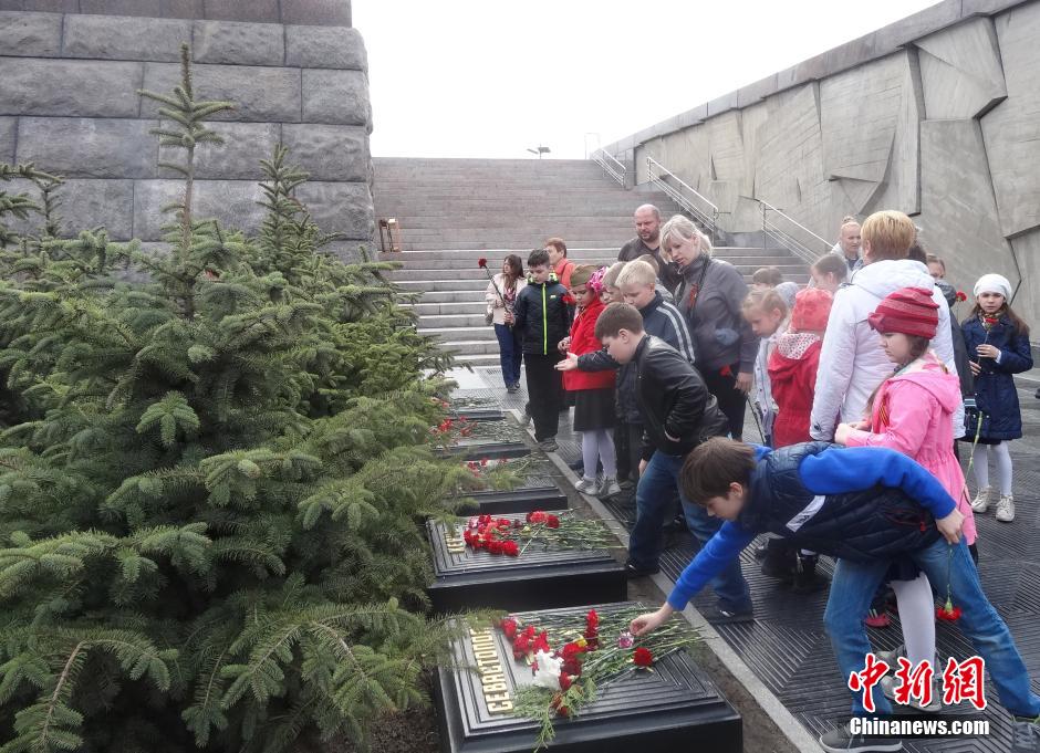 5月7日,俄罗斯圣彼得堡二战胜利广场。俄罗斯少年儿童向二战“英雄城市”纪念物献花。 中新社发 田冰 摄