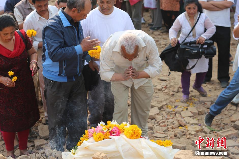 5月7日,尼泊尔“4?25”大地震发生第13天,已知遇难人数逼近8000人。按照尼泊尔传统观念,人去世第13天是灵魂离开躯体的日子。在首都加德满都,人们捧着鲜花走向寺庙和废墟,悼念在地震中不幸离世的同胞和亲人。当天,数百位尼泊尔民众聚集在杜巴广场,许多人身着一袭白衣,焚香默哀。中新社发 符永康 摄