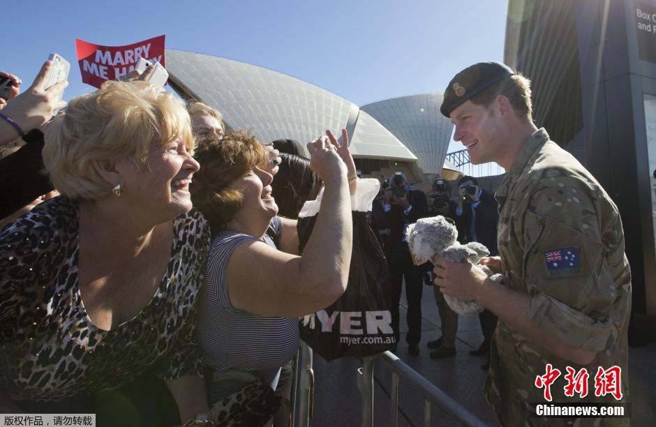 当地时间2015年5月7日,澳大利亚悉尼,英国哈里王子完成在澳洲的服役任务,他参观悉尼歌剧院受到民众的热情欢迎,并获得女粉丝的送上的玩具“考拉”。
