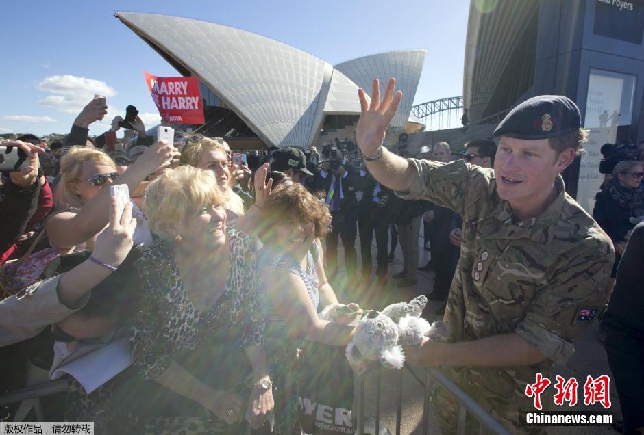 当地时间2015年5月7日,澳大利亚悉尼,英国哈里王子完成在澳洲的服役任务,他参观悉尼歌剧院受到民众的热情欢迎,并获得女粉丝的送上的玩具“考拉”。