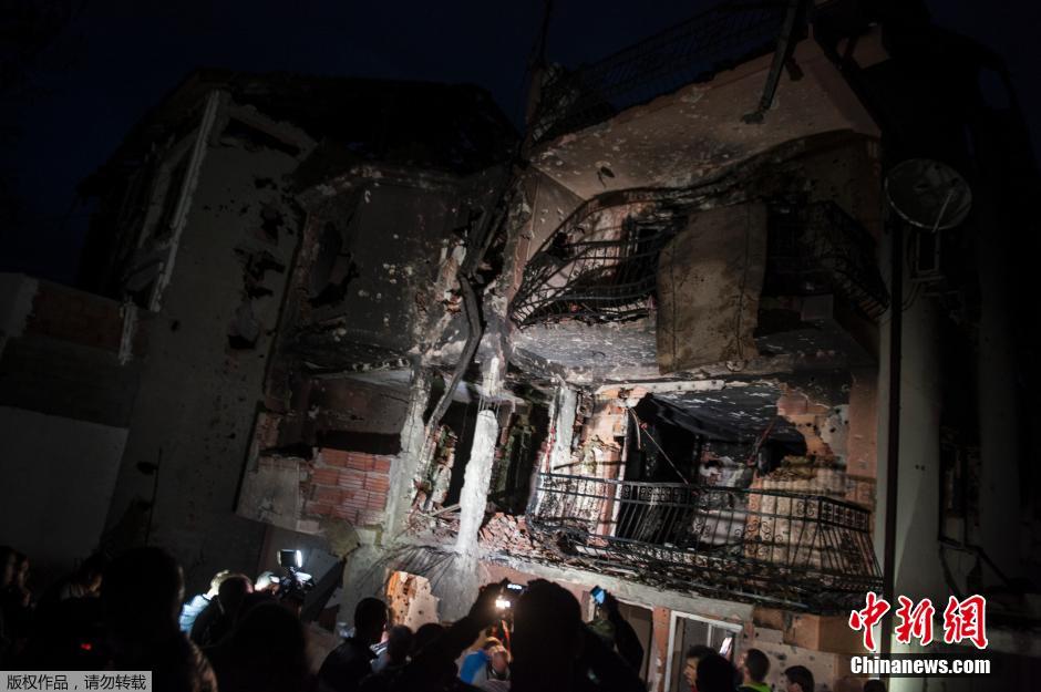 图为当地民众用手机拍摄被炸毁的一栋建筑。有目击者报称,从9日早上开始就听到猛烈的枪声,直升机在城市上空持续盘旋,并能看见一些房屋冒出烟雾。