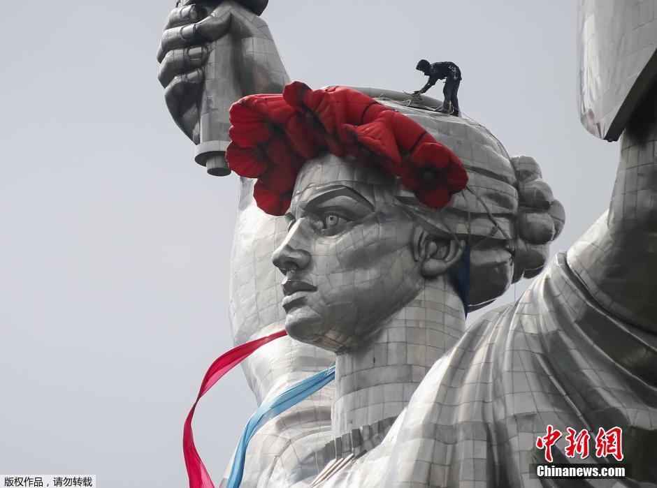 当地时间5月8日,第二次世界大战欧洲战场胜利70周年。欧洲各国举行庆祝活动纪念这一历史时刻。图为基辅的卫国战争博物馆,工作人员用红色罂粟花装饰“祖国母亲”纪念碑。