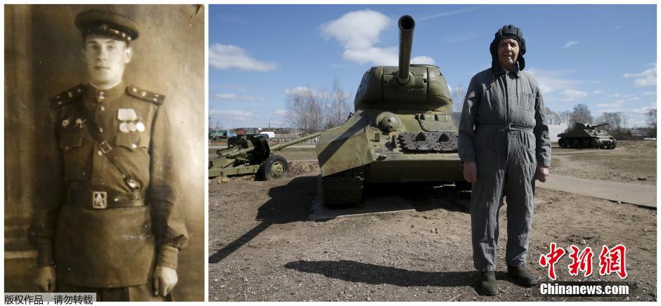 在俄罗斯庆祝卫国战争胜利70周年来临之际,外媒发布了一组二战老兵今昔对比照片。他们身着战时的戎装与武器合影,借此希望和平永存。图为92岁的二战坦克驾驶员Foma Kryuchkov与T-34坦克合影。