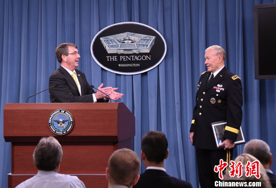 当地时间5月7日,美防长卡特与年内即将卸任的美军参联会主席登普西一同出席发布会。卡特在发布会上称赞登普西的领导能力,并感谢其为自己提供的建议。本月5日,奥巴马提名邓福德为下一任美军参联会主席。 中新社发