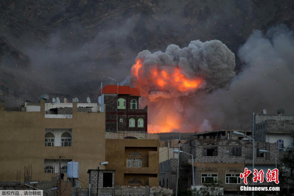 图为遭到空袭的也门军方武器库浓烟滚滚。