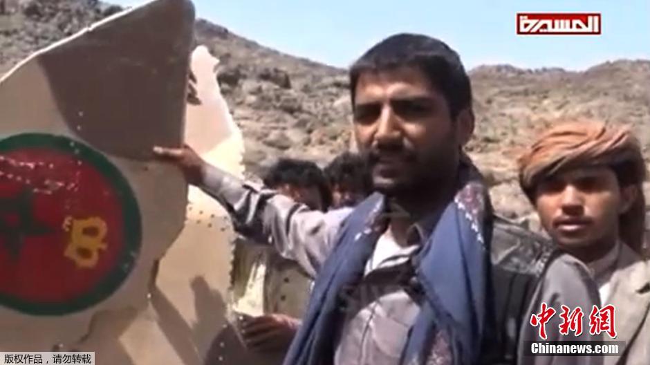 图为也门胡赛武装成员手持飞机残骸庆祝。