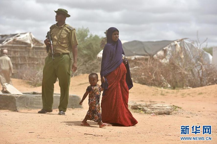 5月8日,在肯尼亚达达布难民营一座医院内,一名难民带着孩子从武装警察前经过。达达布难民营位于肯尼亚加里萨郡,设立于1991年,是全球最大的难民营。索马里内战爆发后,大批民众为躲避战乱和旱灾涌入邻国肯尼亚。据悉,达达布难民营最初设计接纳能力为9万人,但目前经过身份注册的难民人数已超过40万,其中80%的难民是妇女和儿童。新华社记者 孙瑞博 摄 图片来源:新华网