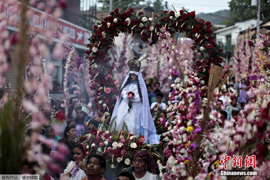 当地时间2015年5月11日,萨尔瓦多潘奇玛尔柯,当地民众庆祝“棕榈与花朵”节。该节日一年举办一次,意在雨季祈求作物丰收。