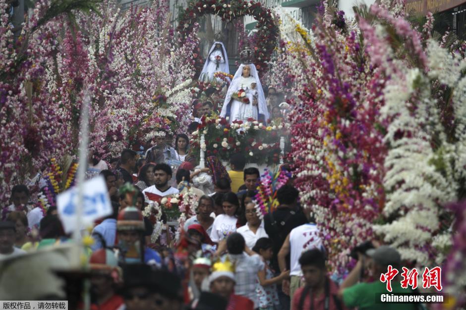 当地时间2015年5月11日,萨尔瓦多潘奇玛尔柯,当地民众庆祝“棕榈与花朵”节。该节日一年举办一次,意在雨季祈求作物丰收。