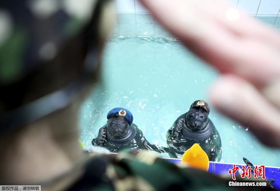 当地时间5月9日,莫斯科红场举行盛大阅兵式庆祝卫国战争胜利70周年。在俄罗斯的伊尔库茨克水上公园里,海豹们也身着“军装”认真的在水中列队接受训练员的检阅。