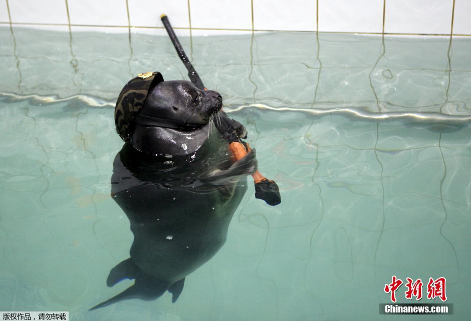 俄罗斯海豹“扛枪”水中列队接受检阅