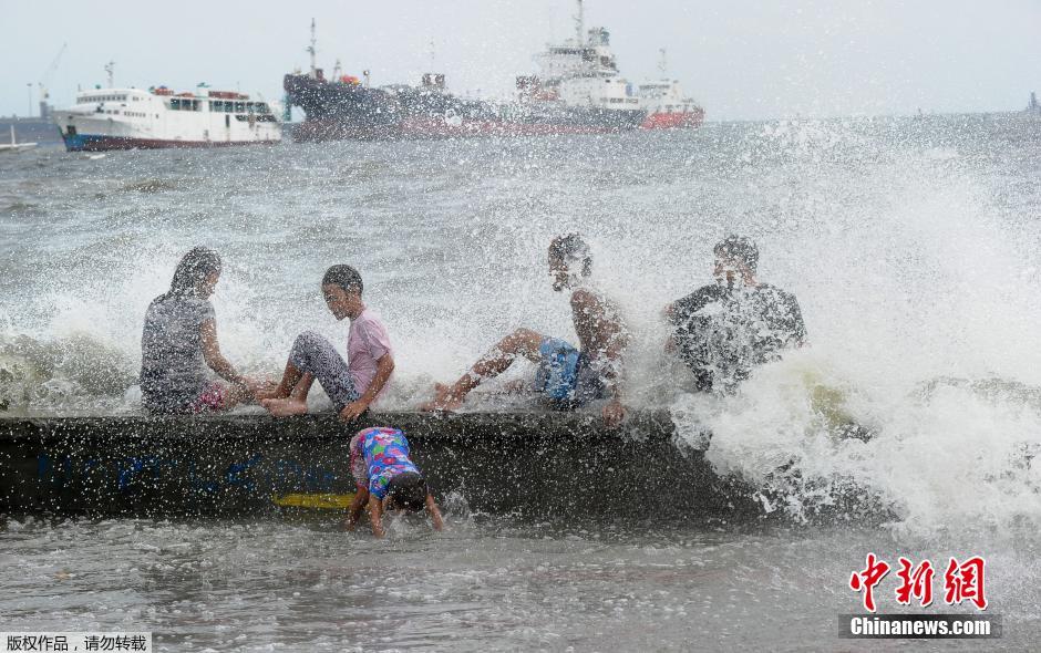 当地时间5月10日,菲律宾北部,马尼拉湾,一群儿童在岸边迎着台风带来的大浪嬉戏。强台风“红霞”袭击菲律宾东北部地区的卡加延省,导致许多地区停电,数千人逃离家园。目前还没有人员伤亡消息。