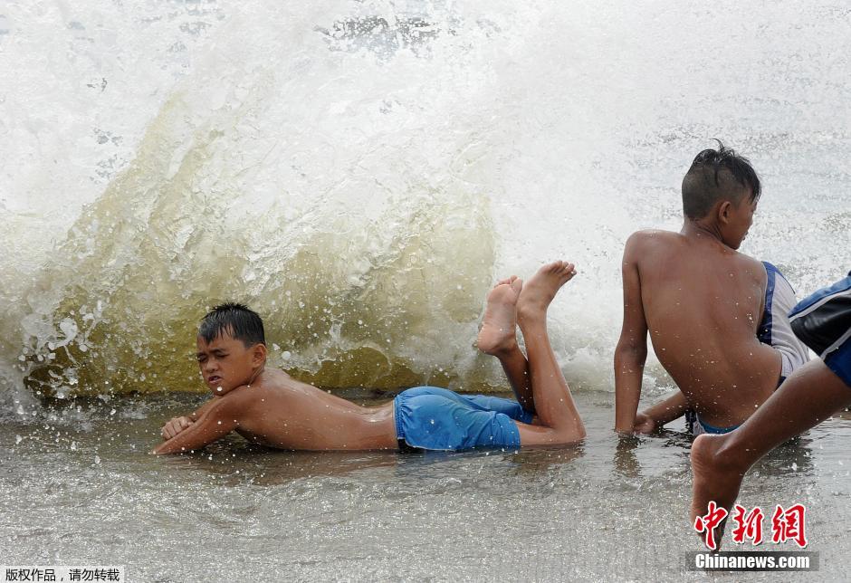 图为当地儿童们在大浪中玩耍。菲律宾海洋天气部门的负责人表示,“红霞”非常危险,是今年以来最强烈的一次台风。台风已经迫使当地取消航班、渡轮服务。