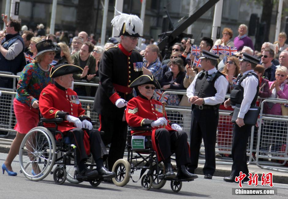 5月10日,英国政府在伦敦市中心举办盛大活动,纪念第二次世界大战胜利70周年。图为部分二战老兵参加纪念游行。 中新社发 周兆军 摄