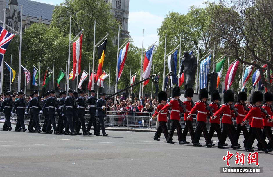 5月10日,英国政府在伦敦市中心举办盛大活动,纪念第二次世界大战胜利70周年。图为英国皇家礼兵部队参加纪念游行。 中新社发 周兆军 摄