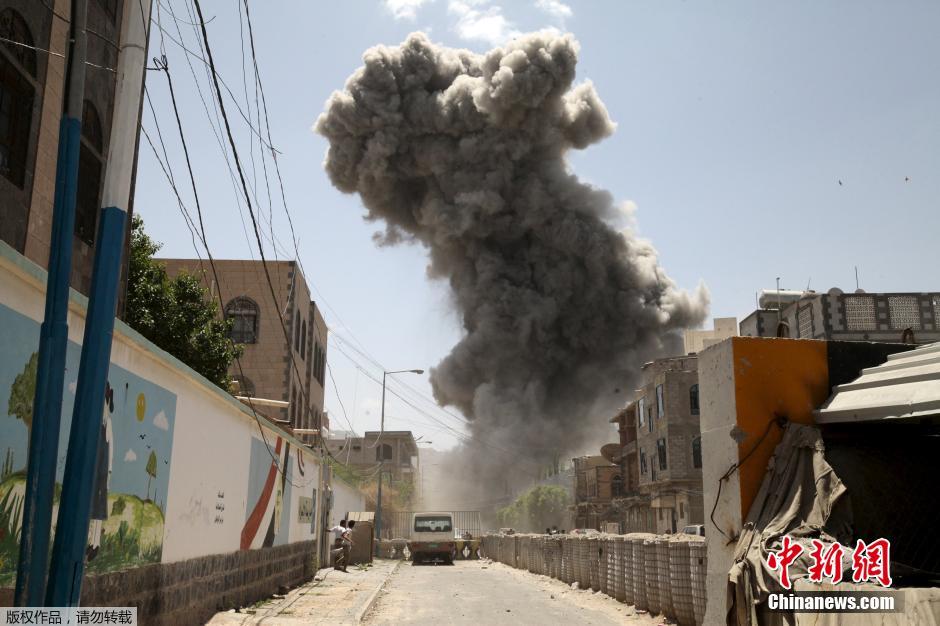 当地时间5月10日,也门首都萨那,沙特等多国部队空袭也门前总统萨利赫位于首都萨那的住所。据也门哈巴尔通讯社报道,萨利赫及其家人在这次空袭中“平安无事”。图为空袭现场。