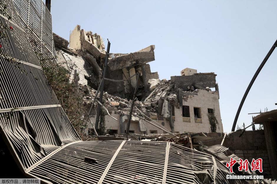 图为也门前总统萨利赫的住所,在空袭过后变成一片废墟。