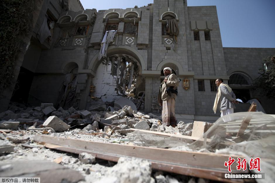 图为手持武装的守卫人员在遭空袭的也门前总统萨利赫的住所处巡逻。