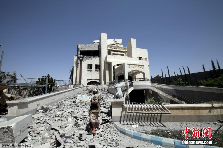 图为也门前总统萨利赫的住所,在空袭过后变成一片废墟。