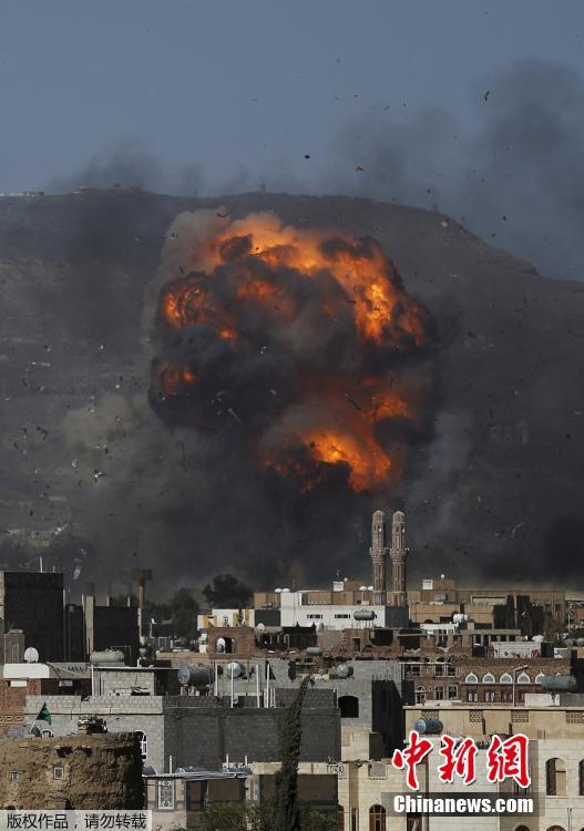 当地时间2015年5月12日,也门萨那,胡塞武装控制的一处军事据点遭空袭,空中升起滚滚黑烟。