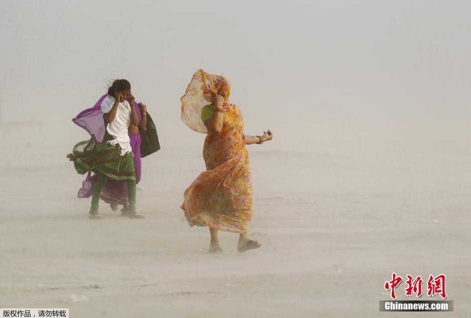 当地时间5月12日,印度安拉阿巴德遭遇沙尘暴天气,当地民众在大风扬起的沙尘中艰难前行。