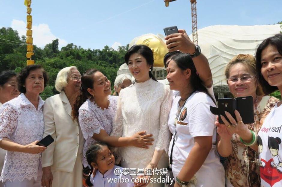 当地时间5月10日,泰国前总理英拉前往北标府景溪县的Wat Pha Sawang Bun佛寺拜佛布施,当地民众纷纷要求与之合影。图片来源:泰国星暹日报官微
