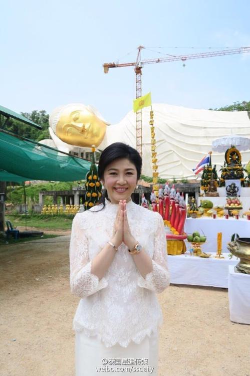 当地时间5月10日,泰国前总理英拉前往北标府景溪县的Wat Pha Sawang Bun佛寺拜佛布施,当地民众纷纷要求与之合影。图片来源:泰国星暹日报官微